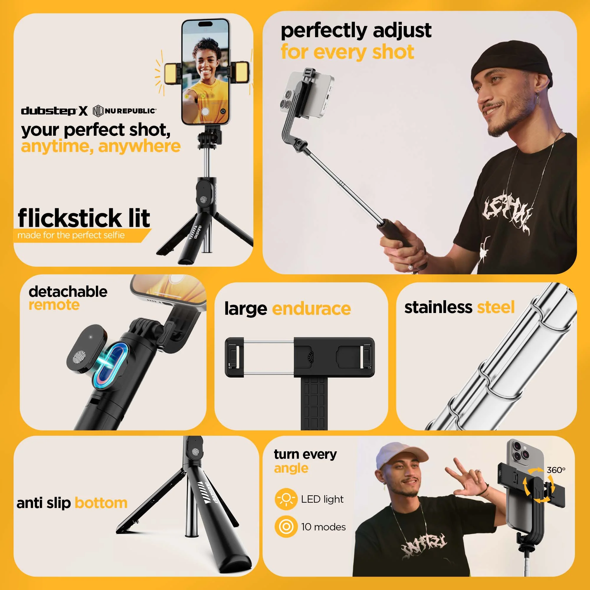 The dubstep's flickstick lit extendable selfie stick the ultimate tool for flawless selfies. with three adjustable light modes-warm, cool and natural. It adapts to any setting, ensuring perfect lighting for every shot, whether indoors, outdoors, or during a professional photoshoot.