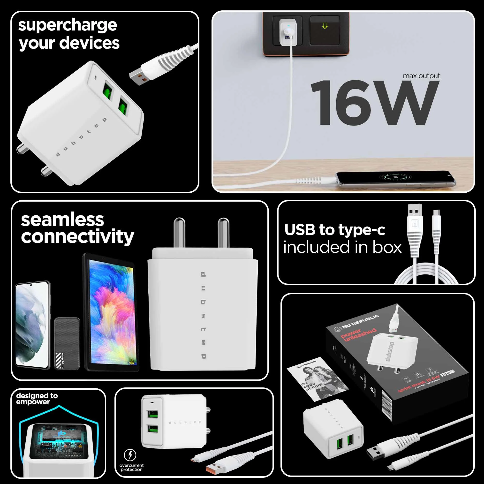 Supercharge your device with Dubstep Streak 16W charger. Featuring super-fast 16W charging, built-in thermal management system, dual USB ports and Dubstep proprietary powerblitz™ technology, Streak 16W will take care of all your charging needs.